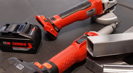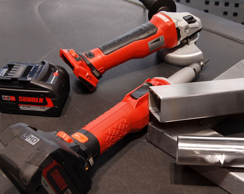 The battery tools set new standards in terms of power and efficiency. Feel the cordless freedom when working on your workpieces as well as the outstanding performance of these power packs, provided by the "state-of-the-art" brushless motor, which ensures high and constant pulling power. The new battery series offers many application possibilities, be it for grinding and polishing stainless steel pipes in railing construction, machining fillet welds and mitres on machines and apparatus in the pharmaceutical and food industries or for levelling line matting in foundries, in kitchen furniture production and in container construction - the new SUHNER battery series is always your reliable partner!